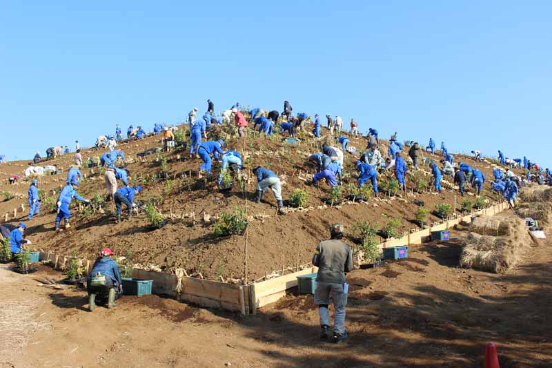 Around 12,000 young trees were planted on the day by about 260 people including most of the staff of Toyama. Another 8000 trees will be planted in October 2014, with a total of about 20,000 trees being planted all together.
